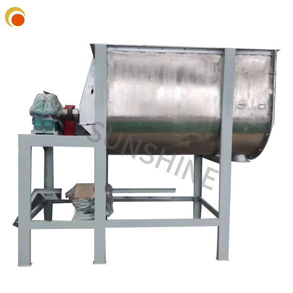 The horizontal mixer is driven by the inner and outer diameter screws installed on the mixing shaft to turn over the material in the barrel, so that the mixer can turn over the animal material in the barrel to the greatest extent. In the structure of the agitator, the spiral is designed as an inner and outer spiral, and the left and right are reversed spirals. When the agitator is working, the inner screw drives the material close to the axis to make the shaft rotate, and the axial direction is pushed from the inside to both sides. Circulation, shear mixing, complete the rapid and uniform mixing of materials in a short time.